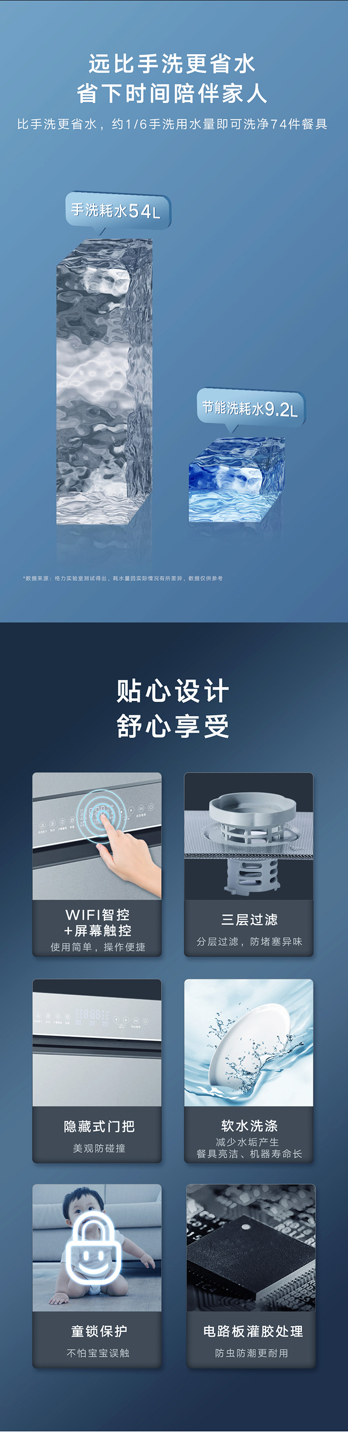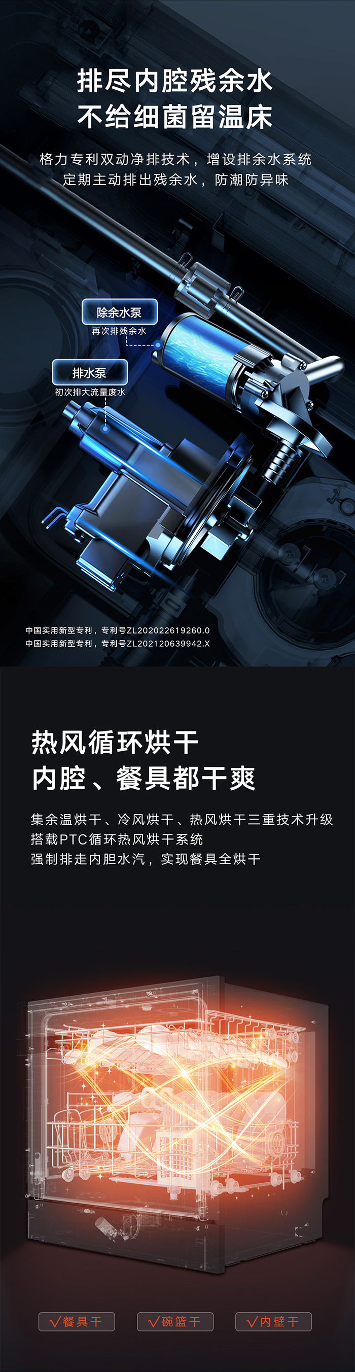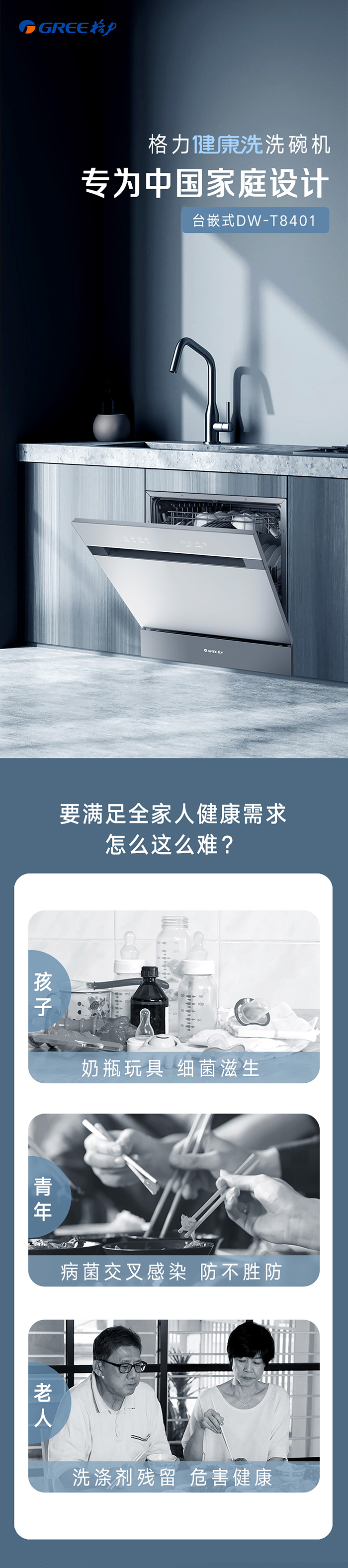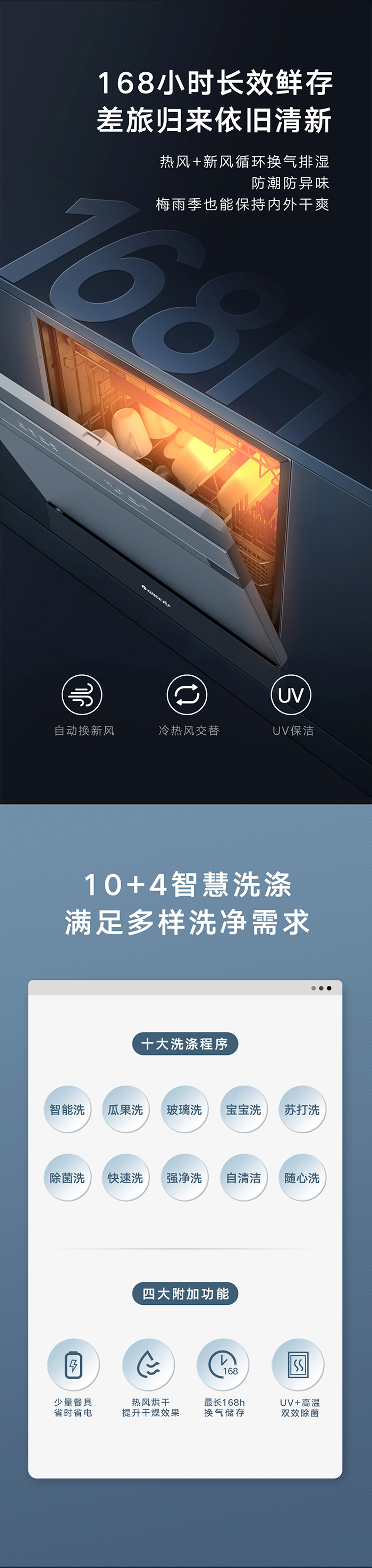 格力健康洗洗碗機,專為中國家庭設計;洗除排烘存更全能;熱風循環烘干,內腔餐具都干爽