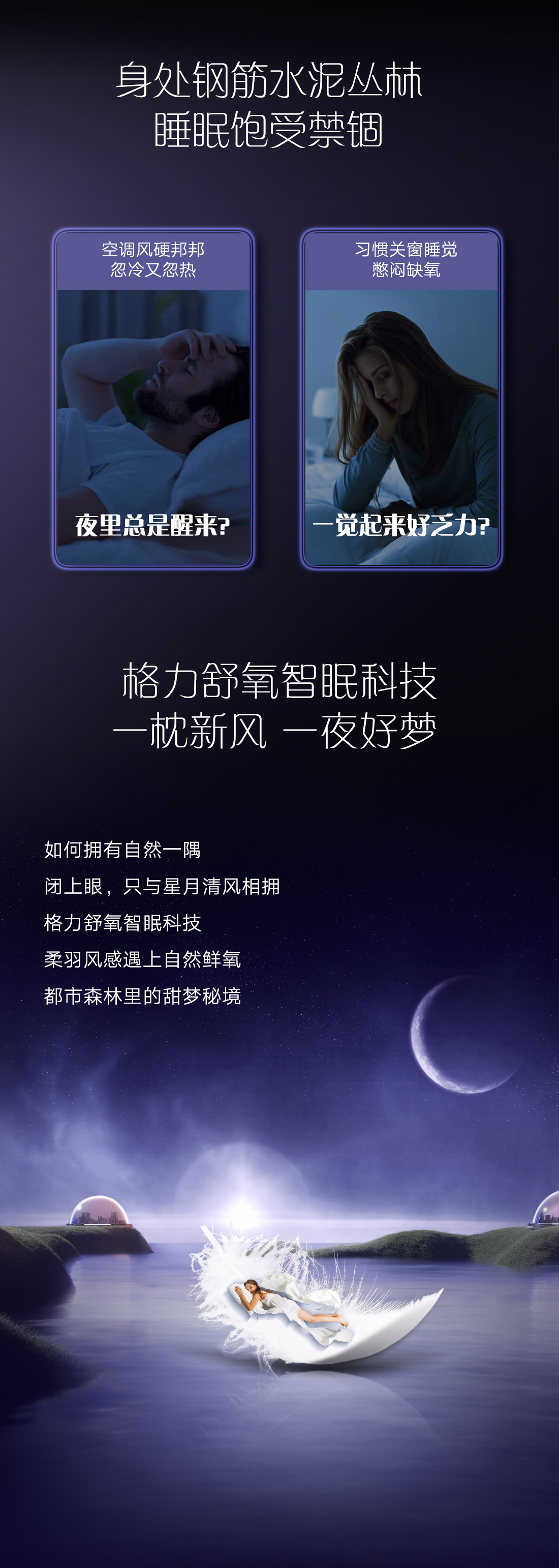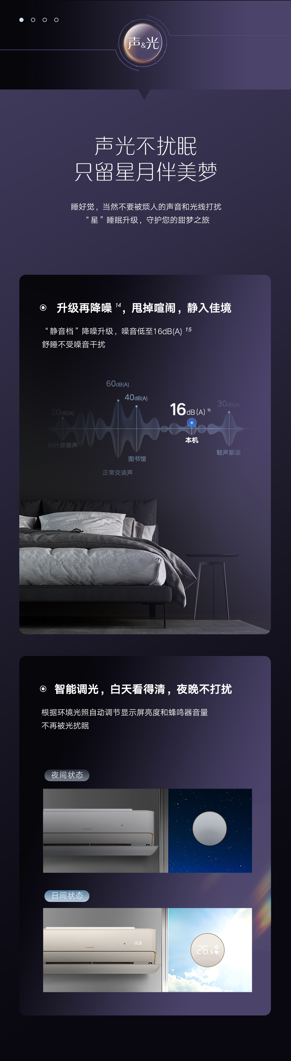 渾然天成,一個優雅的治愈系。仿星緞布紋工藝,星光點點,織錦伴夢。舒氧智眠科技,柔羽風感遇上自然鮮氧,臥室成為身心的棲居圣地。情緒回緩,一夢天光。