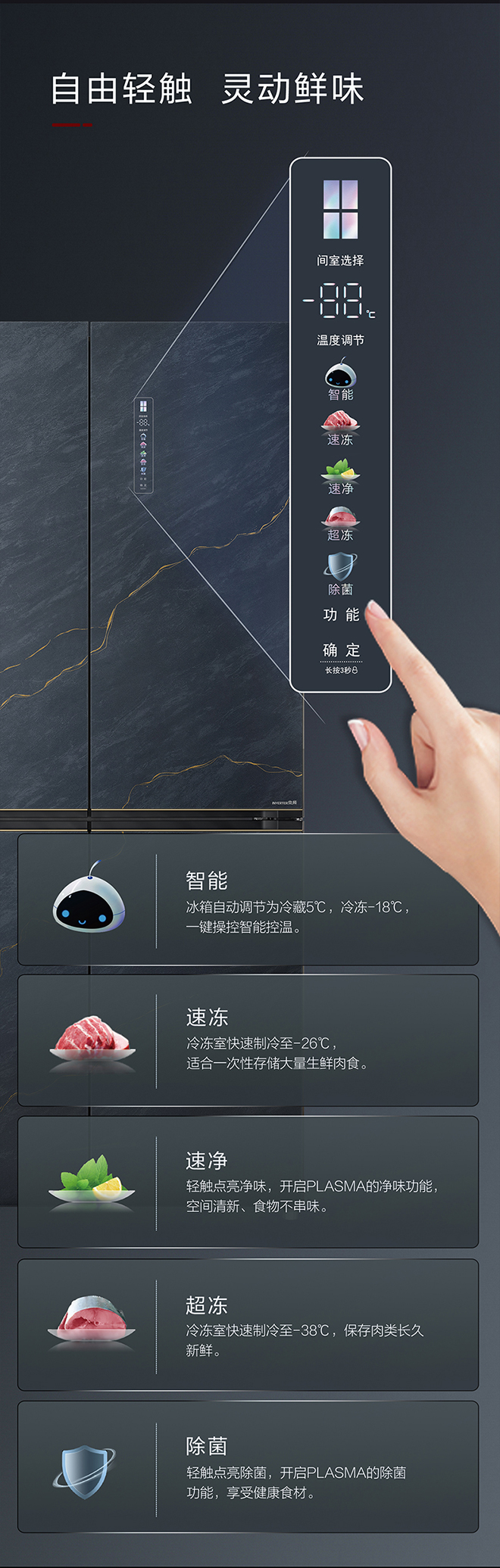 -38℃超凍鎖鮮;PLASMA全空間除菌凈味;平齊不凸出;雙通道循環(huán)散熱